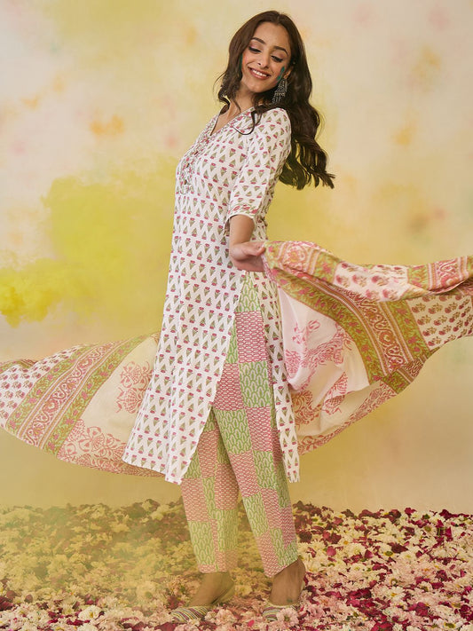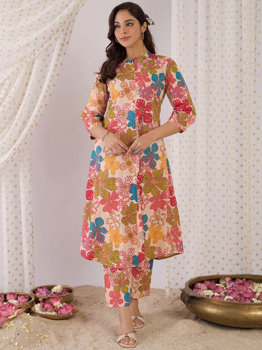 Dhiyona IE Floral Printed Mandarin Collar Pure Cotton A-Line Kurta With Trouser