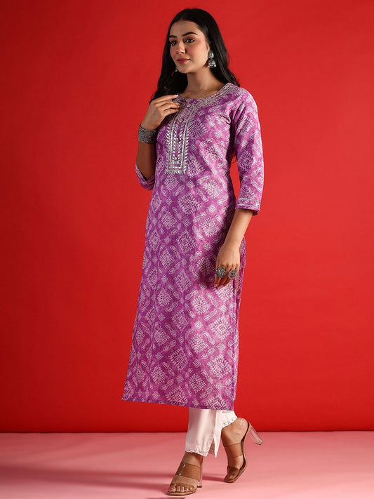 Dhiyona IE Bandhani Printed Round Neck Long Sleeves Straight Cotton Kurta