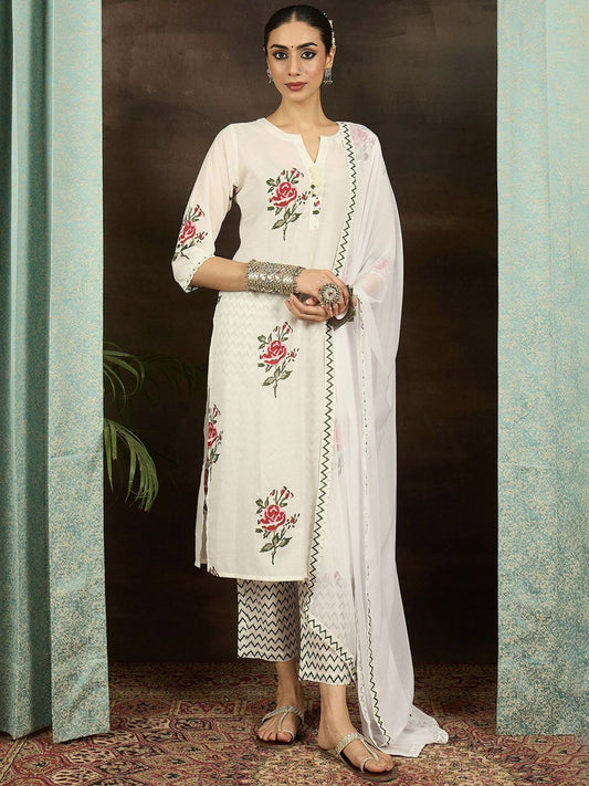 Dhiyona IE Floral Printed Mandarin Collar Pure Cotton Kurta With Trousers & Dupatta