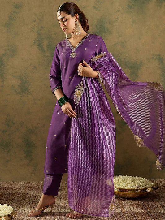 Dhiyona IE Floral Yoke Design V-Neck Sequinned Detail Straight Kurta & Trousers With Dupatta