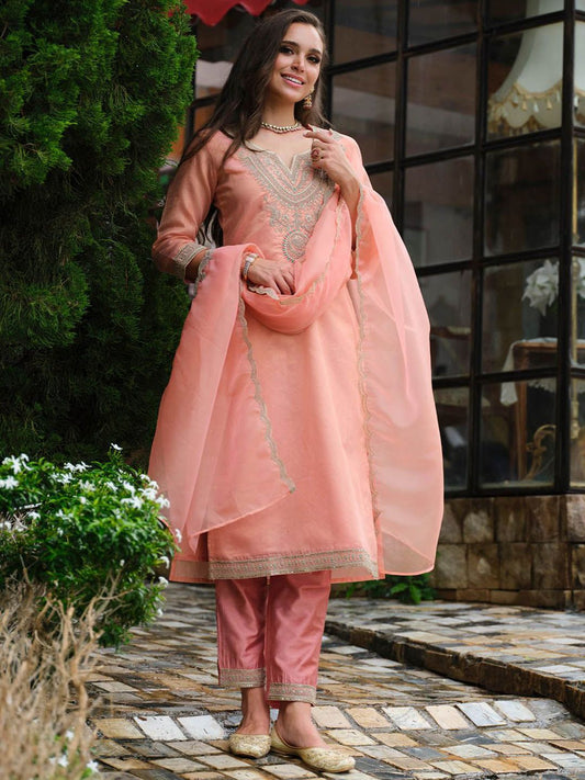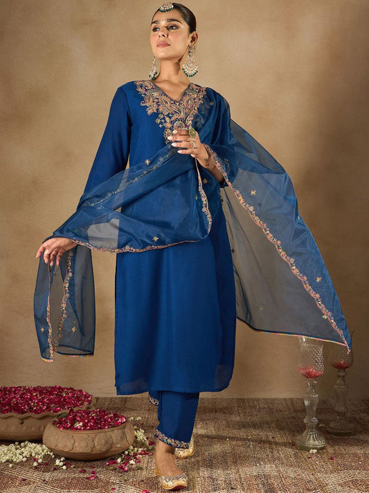 Dhiyona IE Floral Embroidered V-Neck Thread Work Straight Kurta & Trousers & Dupatta