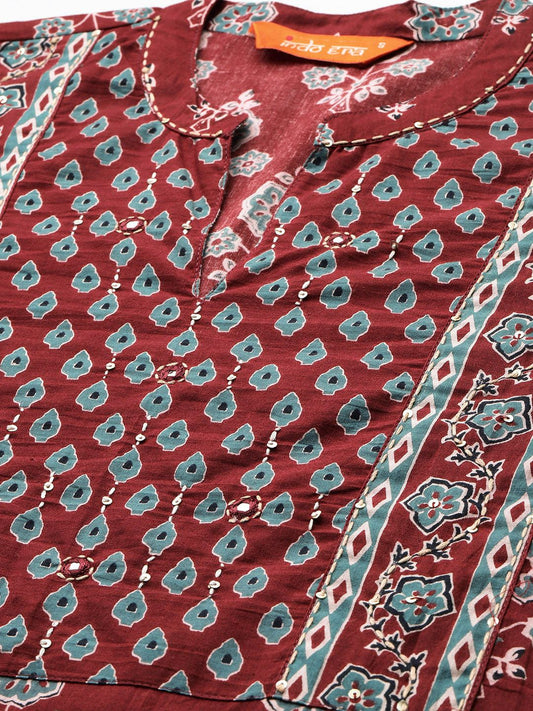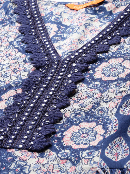 Dhiyona IE Floral Printed Angrakha Mirror Work Pure Cotton Kurta with Trousers