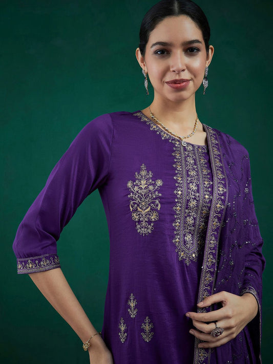 Dhiyona IE Ethnic Motifs Embroidered Round Neck Straight Kurta with Trousers & Dupatta