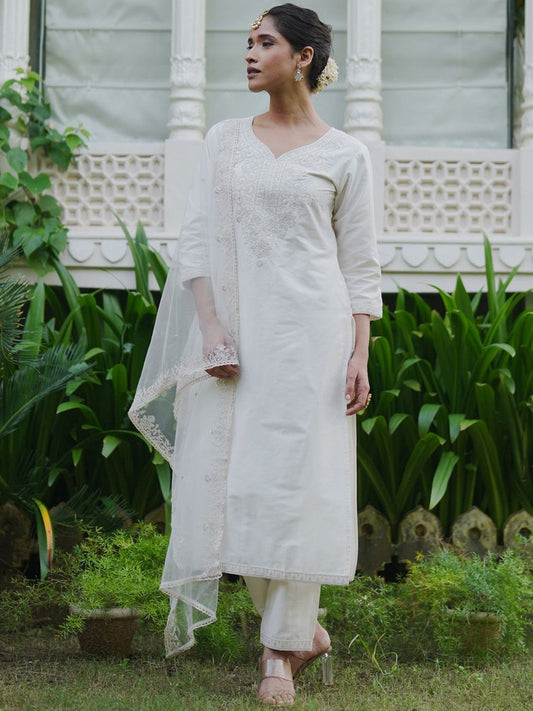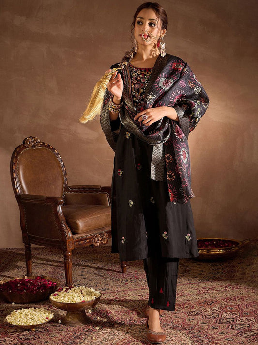 Dhiyona IE Floral Embroidered Thread Work Kurta with Trousers & Dupatta