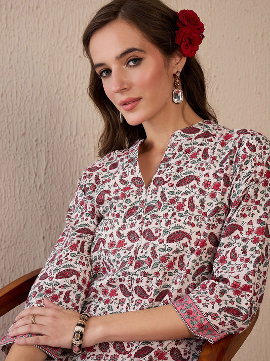 Dhiyona IE Women Floral Printed Keyhole Neck Pure Cotton Kurta