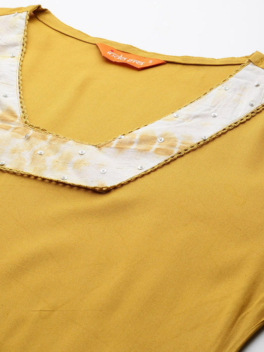 Dhiyona IE Mustard Leheriya Printed Thread Work Pure Cotton Kurta with Trousers & Dupatta