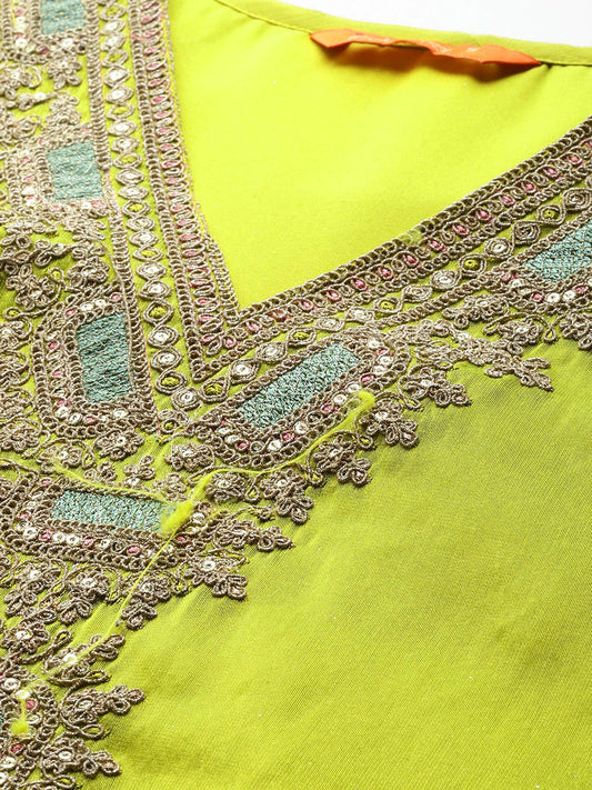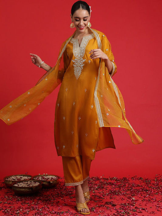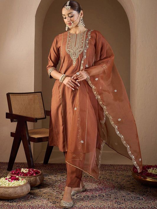 Dhiyona IE Ethnic Motifs Embroidered Sequinned Straight Kurta & Trousers With Dupatta