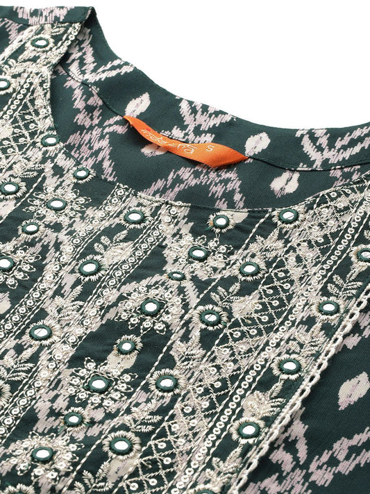 Dhiyona IE Green and White Round Neck Geometric Printed Mirror Work Straight Kurta