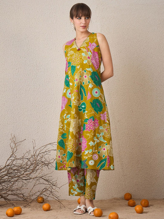 Dhiyona IE Floral Printed Sleeveless V-Neck A-Line Kurta With Trousers