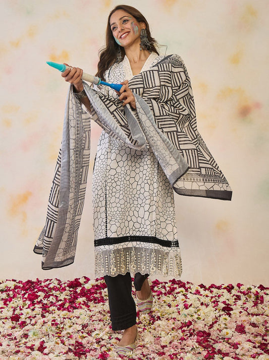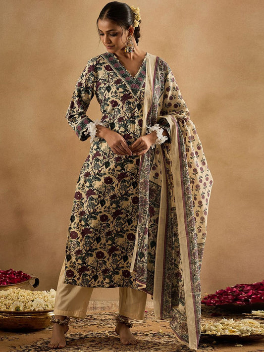 Dhiyona IE Floral Printed V-Neck Pure Cotton Straight Kurta With Trousers & Dupatta