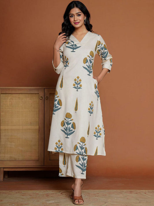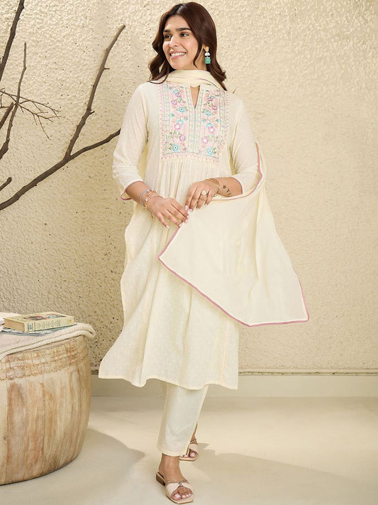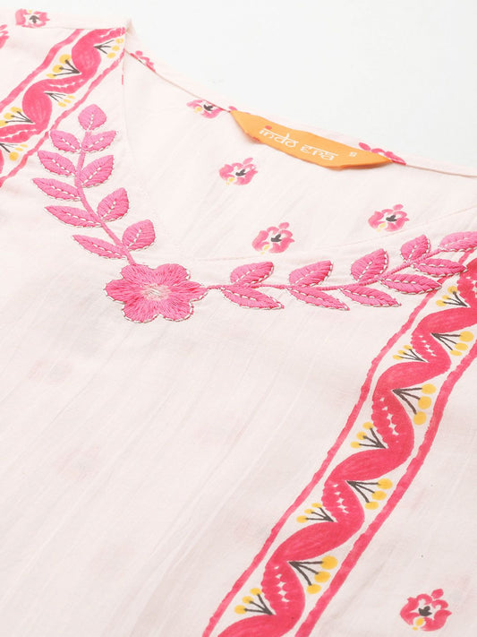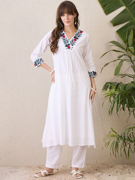Dhiyona IE Floral Yoke Design V-Neck Thread Work Pure Cotton A-Line Kurta With Trouser