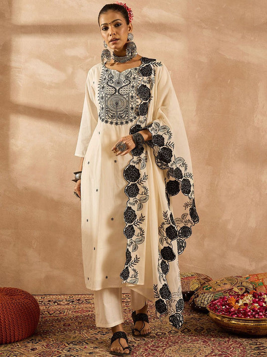 Dhiyona IE Ethnic Motifs Embroidered Panelled Pure Cotton Kurta with Trousers & Dupatta