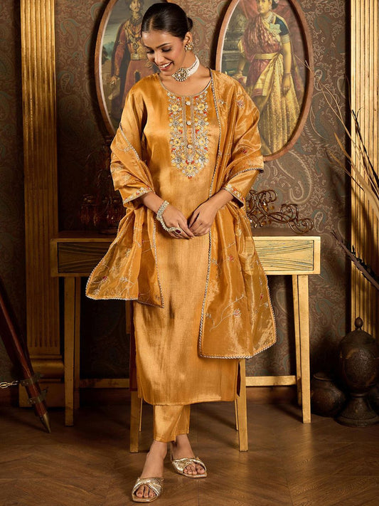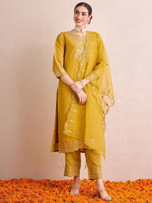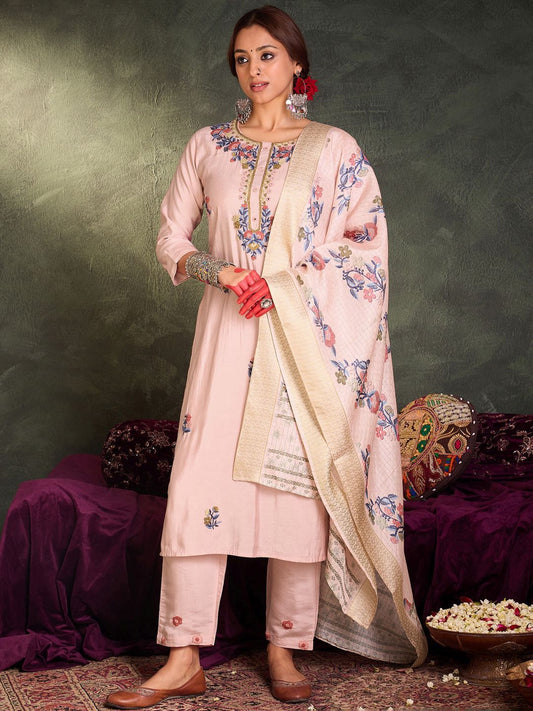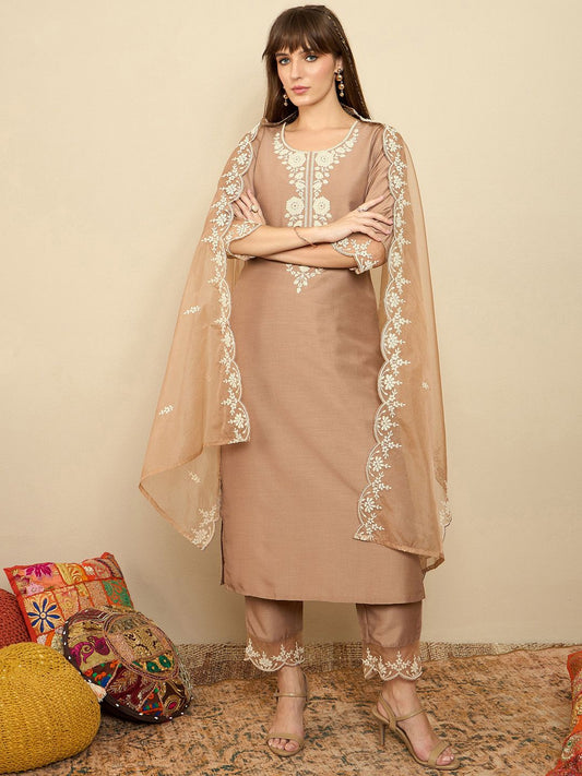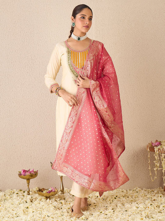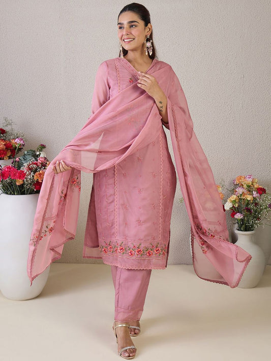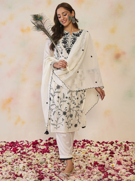 Dhiyona IE Floral Embroidered Thread Work Straight Kurta With Trousers & Dupatta