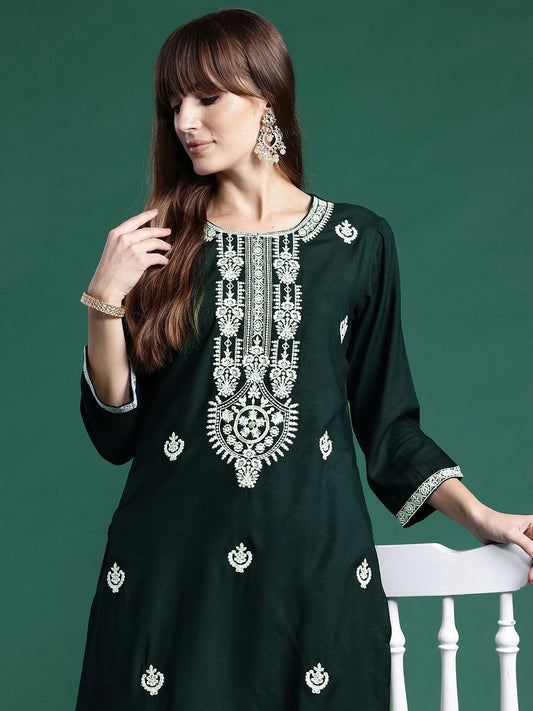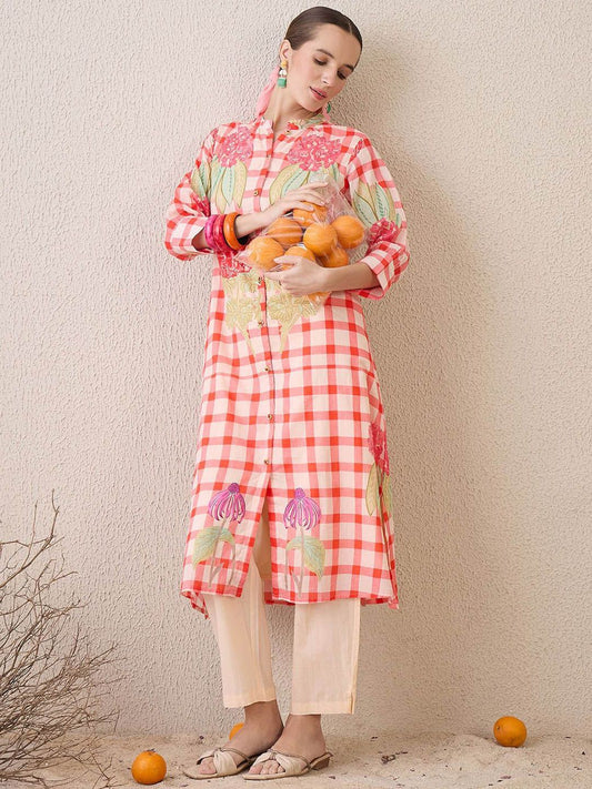 Dhiyona IE Floral Embroidered Thread Work Straight Kurta With Trousers