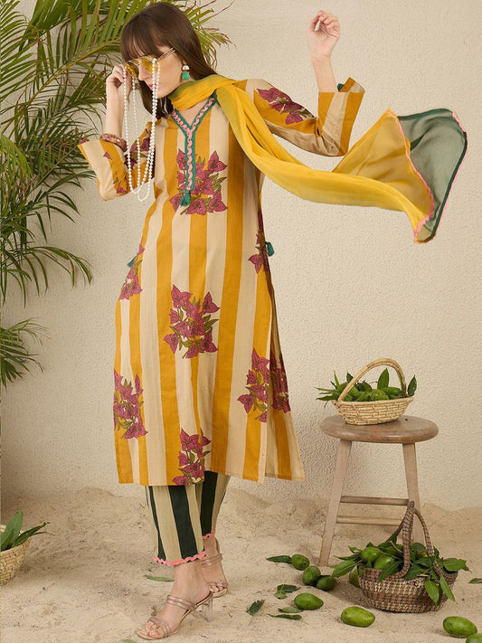 Dhiyona IE Floral Printed Regular Pure Cotton Kurta with Trousers & Dupatta