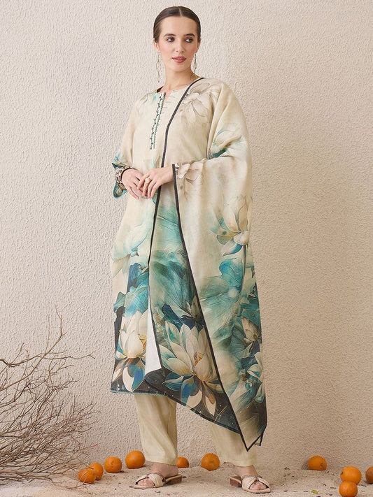 Dhiyona IE Floral Printed Notch Neck Beads & Stones Straight Kurta With Trousers & Dupatta