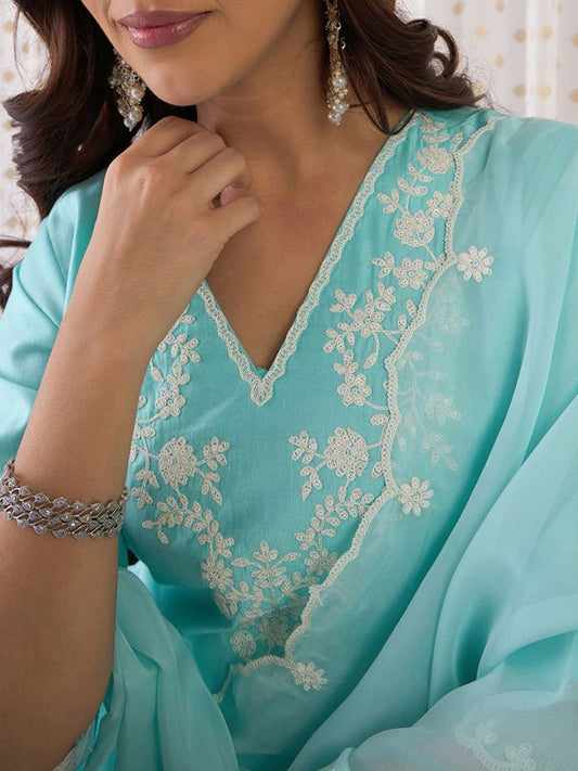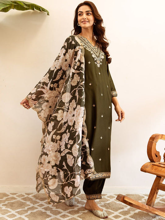 Dhiyona IE Floral Embroidered Thread Work Liva Straight Kurta with Trouser & Dupatta