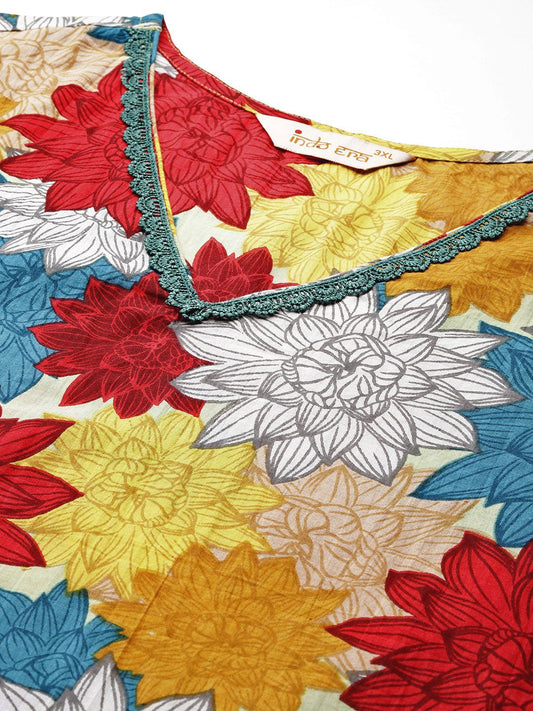 Dhiyona IE Floral Printed Lace Detailed Pure Cotton Kurta with Trousers