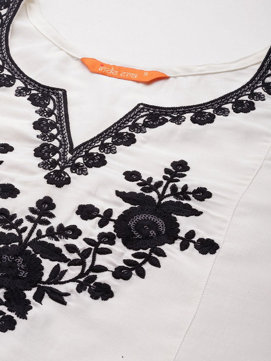 Dhiyona IE Floral Embroidered Notch Neck Thread Work Straight Kurta With Trousers