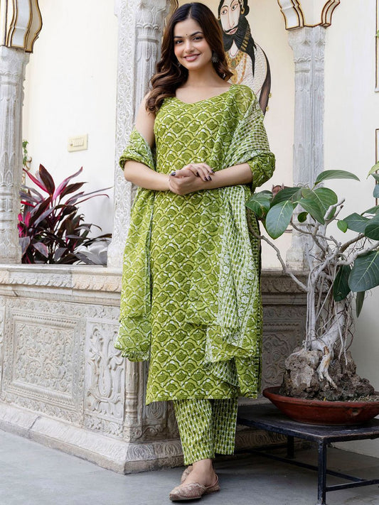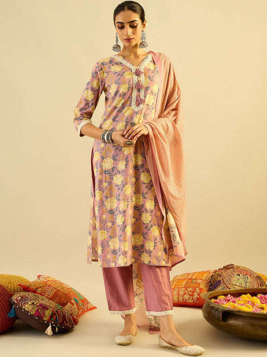 Dhiyona IE Floral Printed V-Neck Pure Cotton Straight Kurta With Trouser And Dupatta