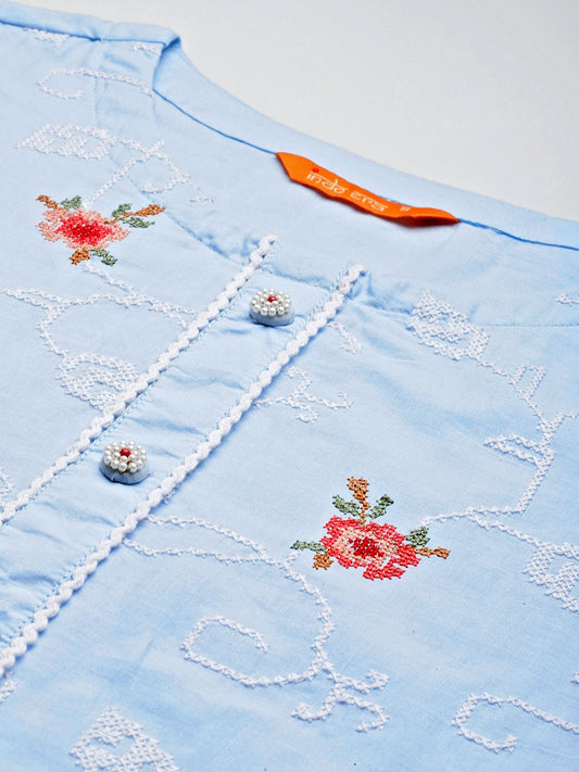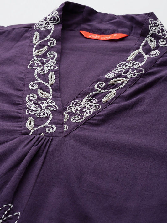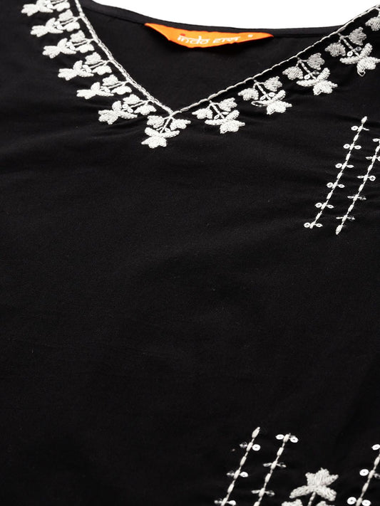 Dhiyona IE Floral Embroidered Thread Work Pure Cotton V-Neck Straight Kurta With Trousers