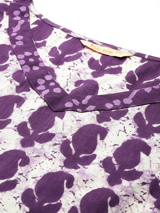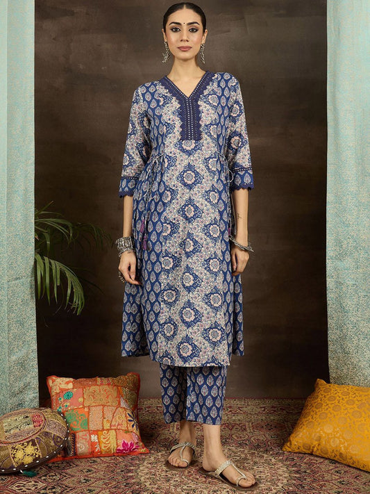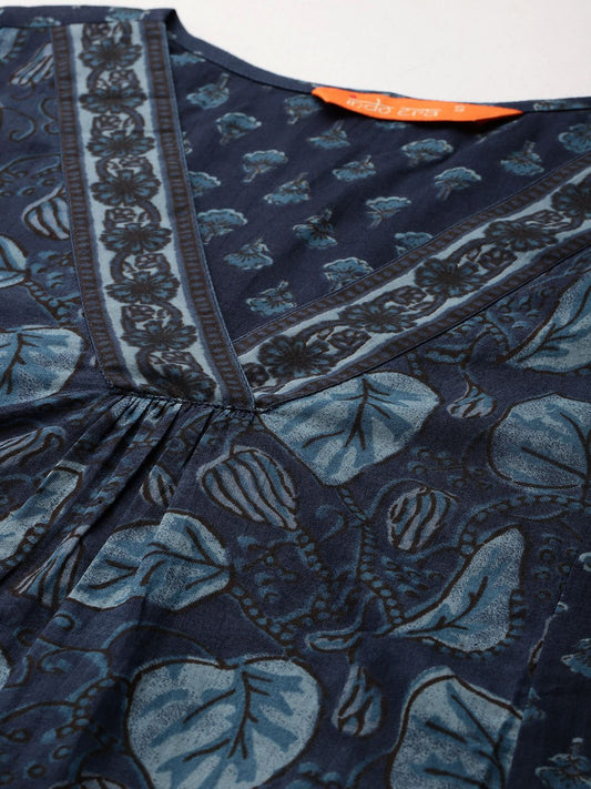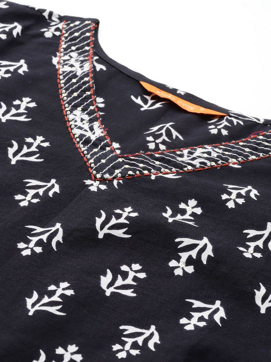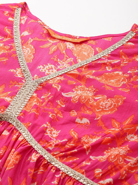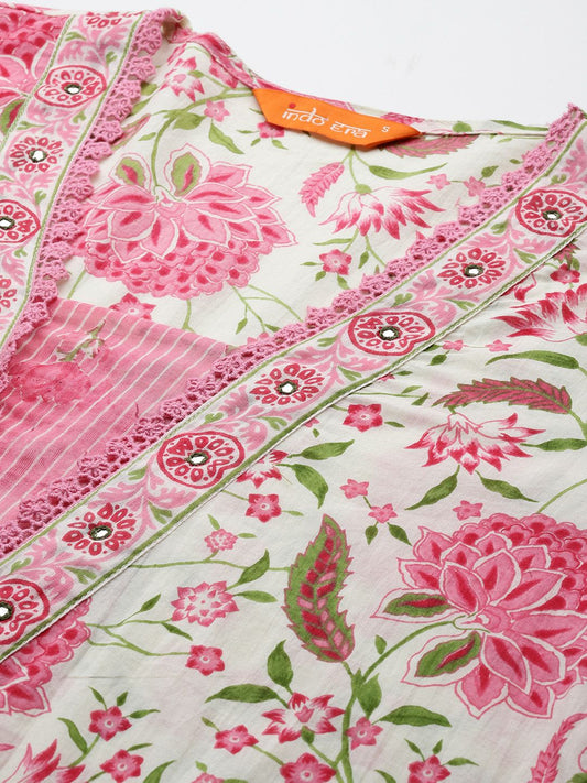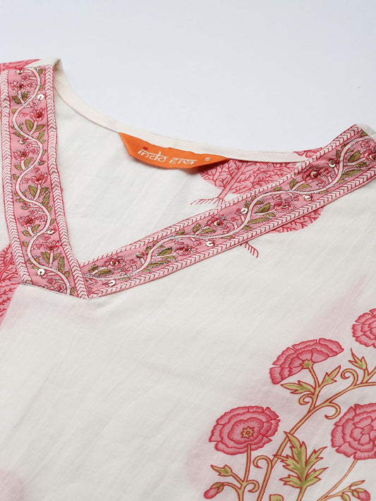 Dhiyona IE Floral Printed V-Neck Pure Cotton A-Line Kurta With Trousers