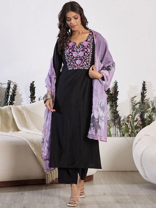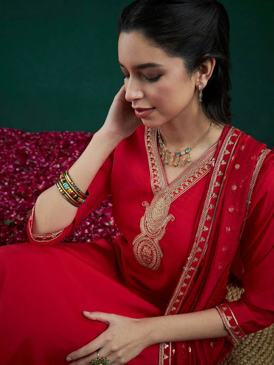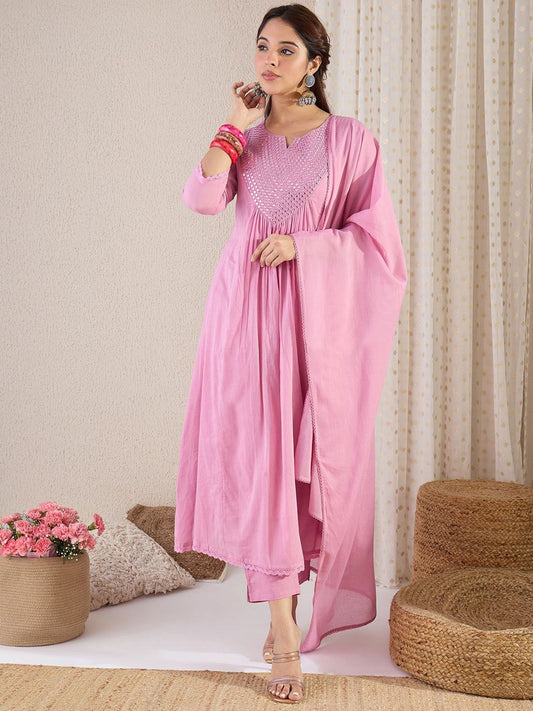 Dhiyona IE Floral Yoke Design Thread Work A-Line Kurta With Trousers & Dupatta