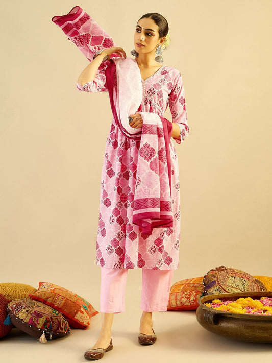 Dhiyona IE Floral Printed Pure Cotton Kurta With Trousers & Dupatta