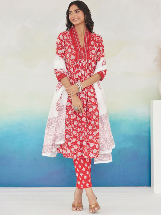 Dhiyona IE Floral Printed Regular Pure Cotton Kurta with Trousers & Dupatta