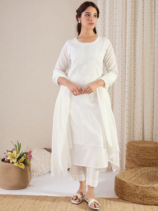 Dhiyona IE Floral Embroidered Pure Cotton Kurta with Trousers & Dupatta