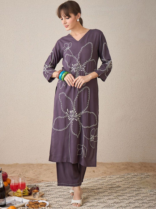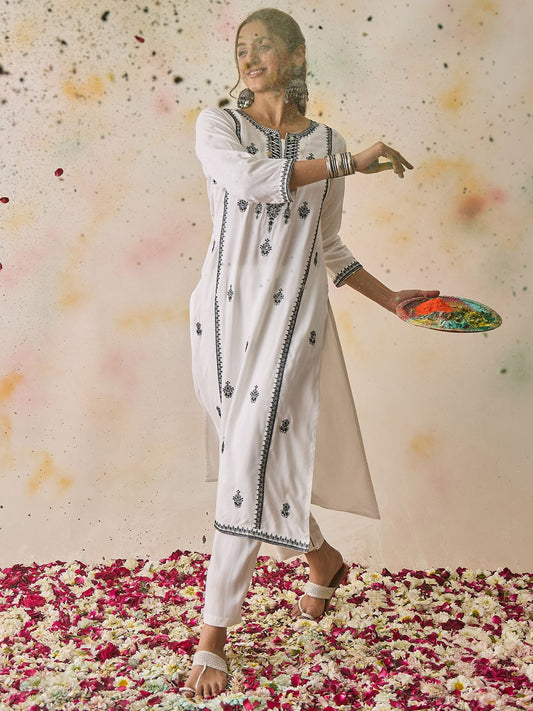 Dhiyona IE Women Floral Embroidered Thread Work Kurta with Trousers