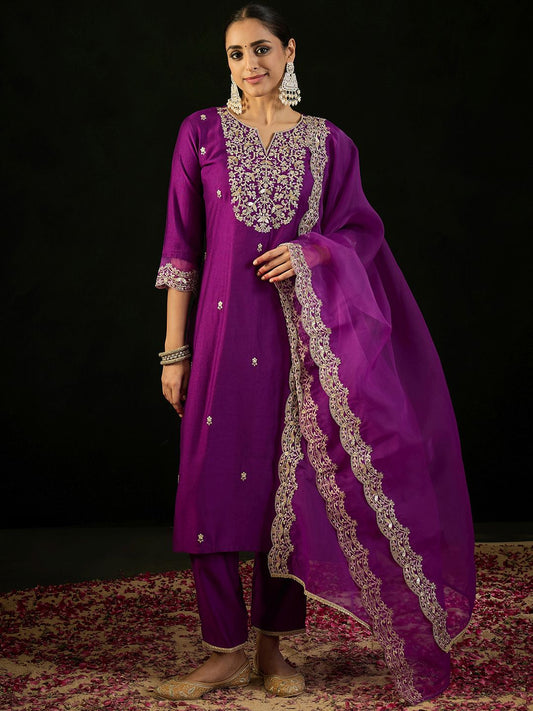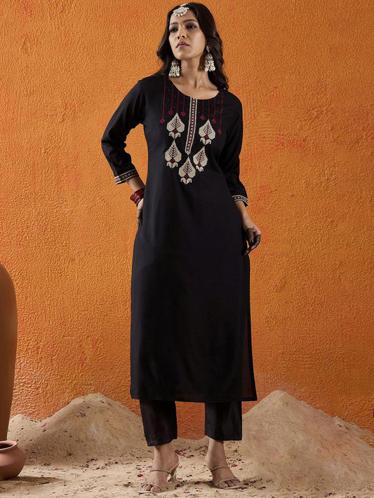 Dhiyona IE Ethnic Motifs Embroidered Liva Straight Kurta With Trousers & Dupatta