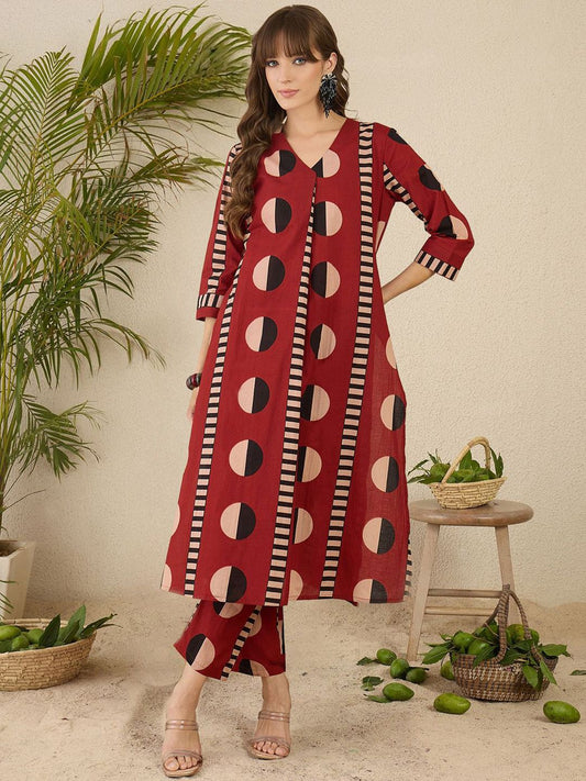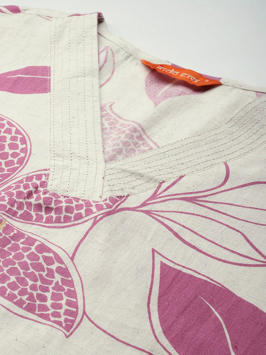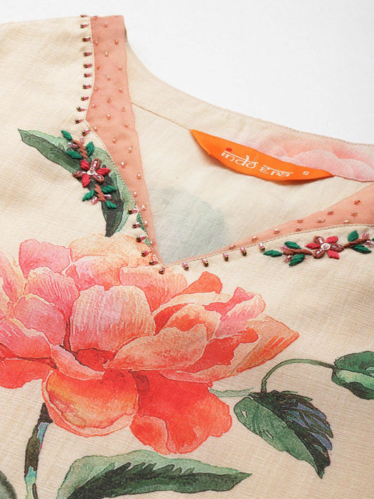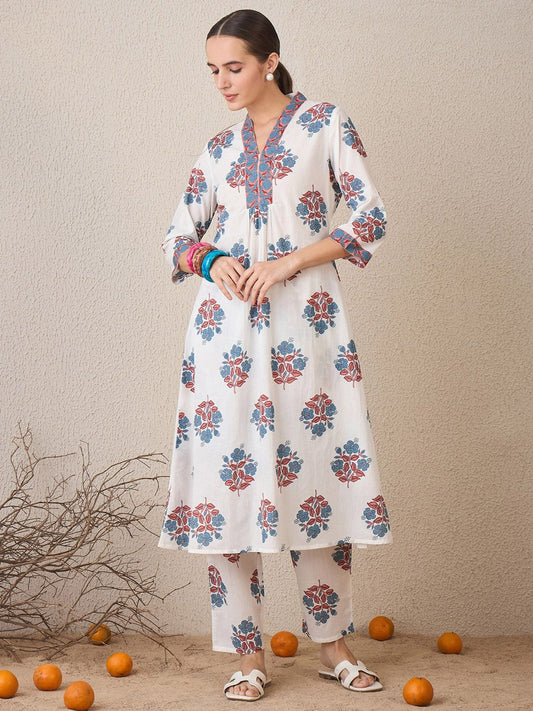 Dhiyona IE Floral Printed V-Neck Cotton A-Line Kurta With Trousers