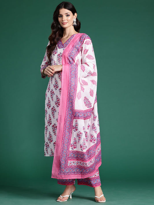 Dhiyona IE Floral Printed Notch Neck Pure Cotton Kurta With Trousers & Dupatta