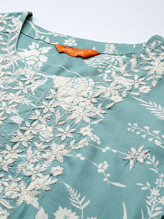 Dhiyona IE Notched Neck Floral Embroidered Liva Kurta with Trouser & Dupatta