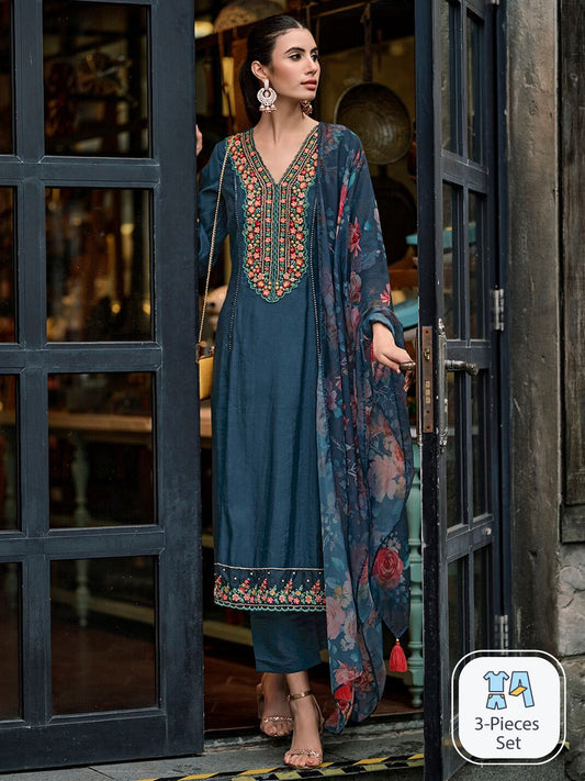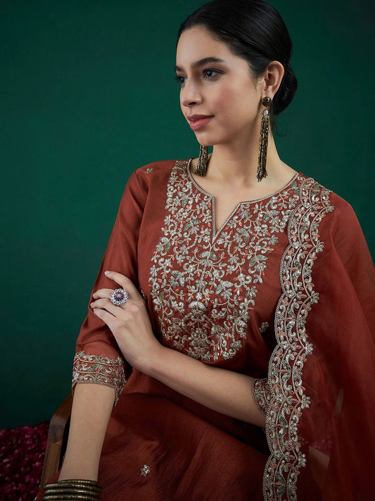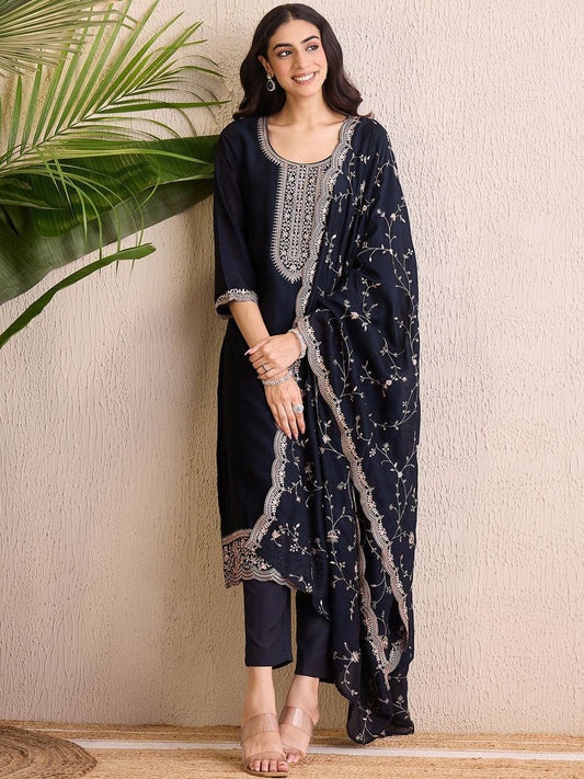 Dhiyona IE Ethnic Motifs Embroidered Thread Work Straight Kurta with Trousers & Dupatta