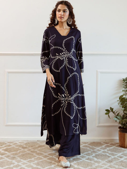 Dhiyona IE Floral Embroidered Panelled Thread Work A-Line Kurta With Trousers & Dupatta