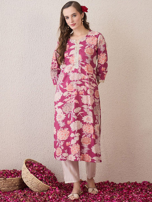 Dhiyona IE Floral Printed Notch Neck Thread Work Cotton Straight Kurta