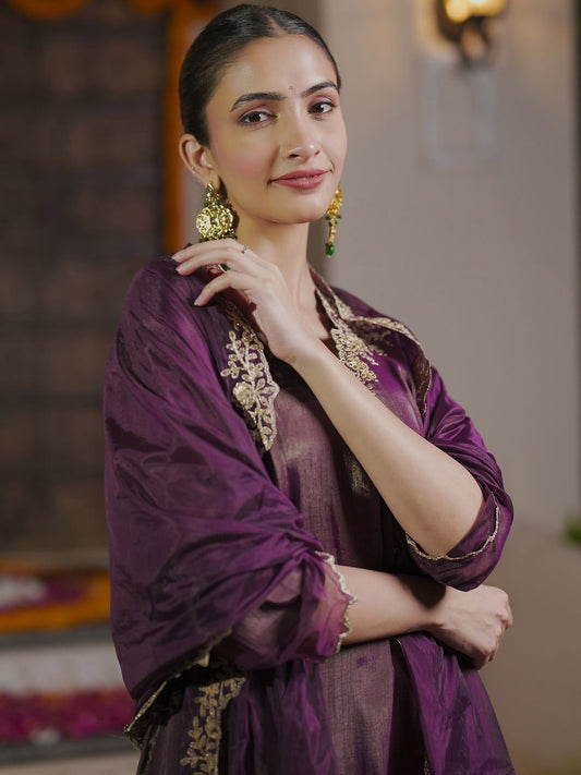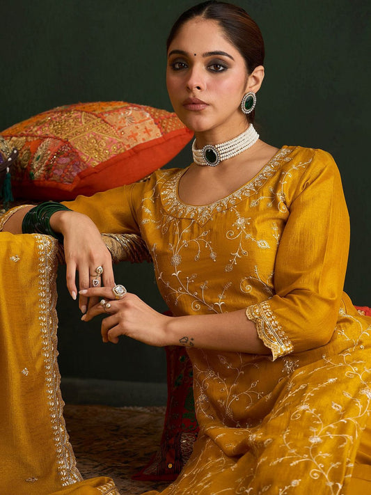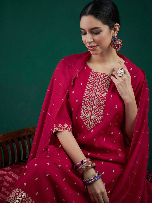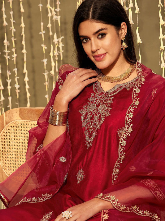 Dhiyona IE Embroidered Sequinned Chanderi Silk Straight Kurta With Trousers & Dupatta