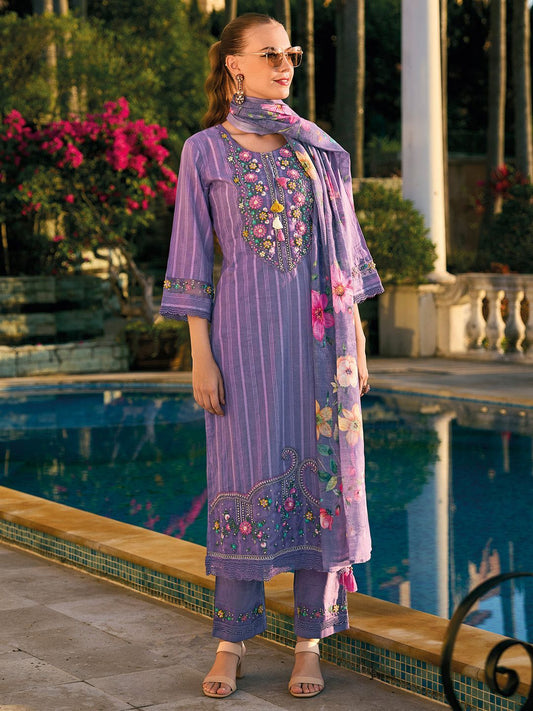Dhiyona IE Round Neck Ethnic Embroidered Pure Cotton Kurta with Trouser & Dupatta