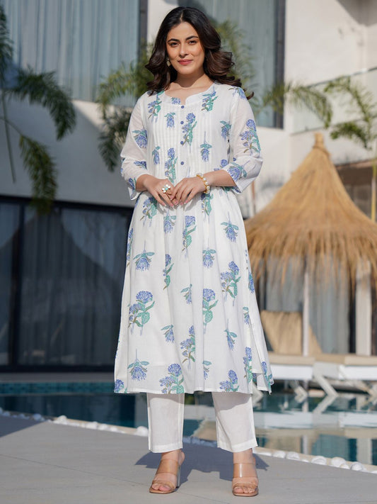 Dhiyona IE Floral Printed Round Neck Panelled A-Line Pure Cotton Kurta With Trousers