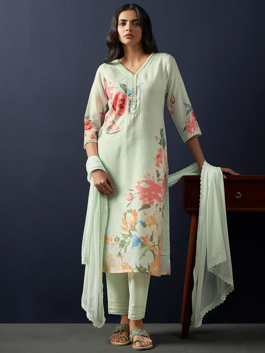 Dhiyona IE Floral Printed Regular Linen Straight Kurta With Trousers & Dupatta