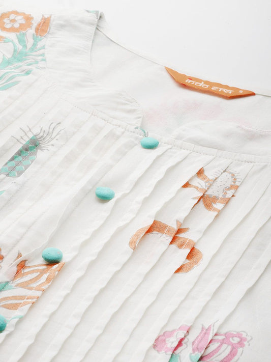 Dhiyona IE Floral Printed Pleated Pure Cotton Kurta with Trousers