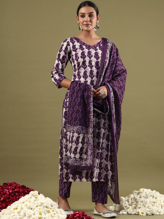 Dhiyona IE Floral Printed V-Neck Pure Cotton A-Line Kurta & Trousers With Dupatta