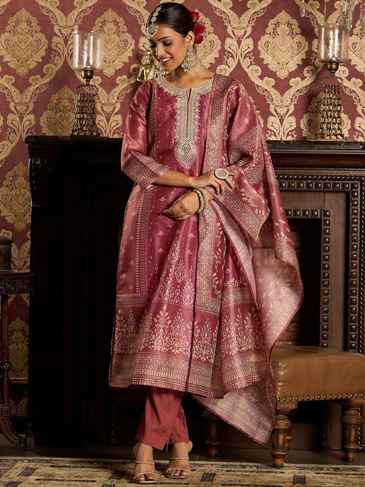 Dhiyona IE Burgundy Floral Printed Mandarin Collar Pure Cotton Kurta with Salwar & Dupatta