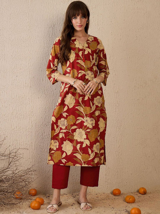 Dhiyona IE Floral Printed V-Neck Pure Cotton Straight Kurta With Trousers