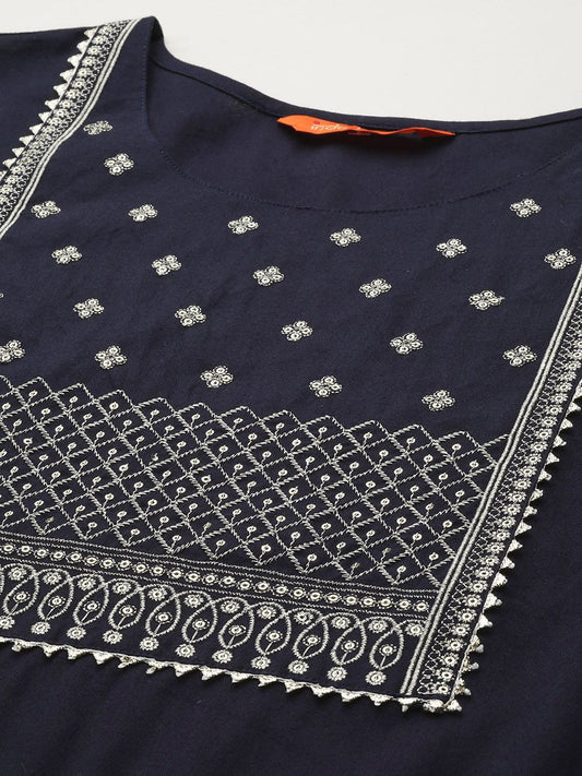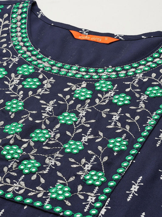 Dhiyona IE Women Navy Blue Floral Printed Thread Work Kurta