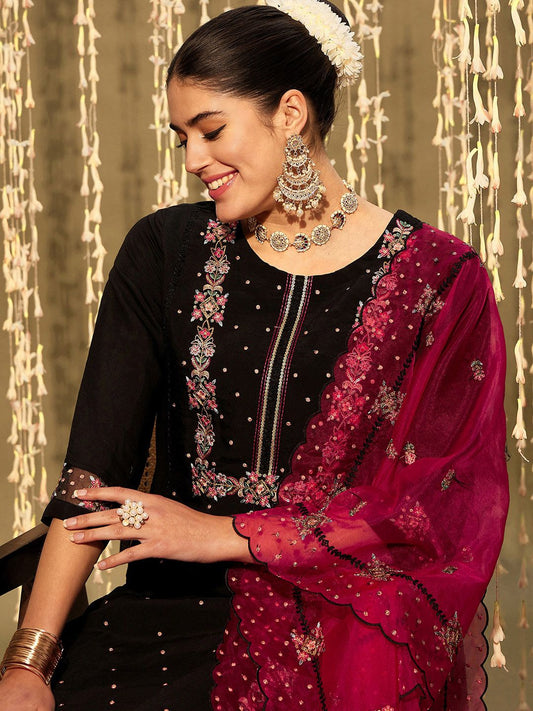 Dhiyona IE Floral Embroidered Thread Work A-Line Kurta With Trousers & Dupatta