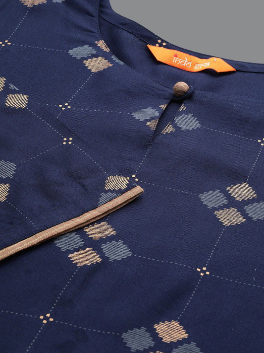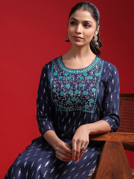 Dhiyona IE Women Navy Blue & Golden Foil Printed Straight Kurta