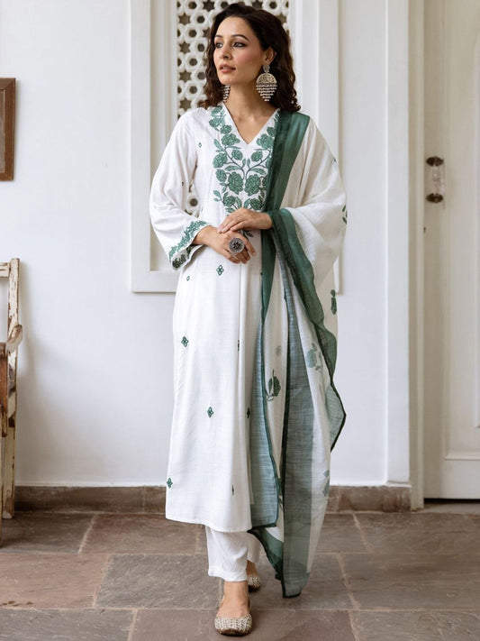 Dhiyona IE Floral Embroidered V-Neck Thread Work Pure Cotton Kurta with Trousers & Dupatta